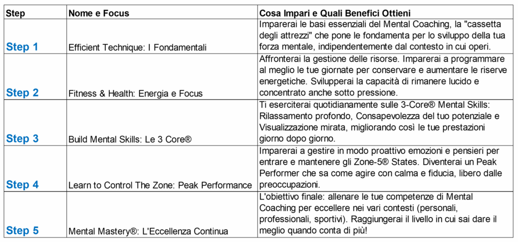 Il nostro approccio è un percorso strutturato e progressivo, ideato per farti acquisire il controllo mentale necessario per eccellere quando conta di più.
